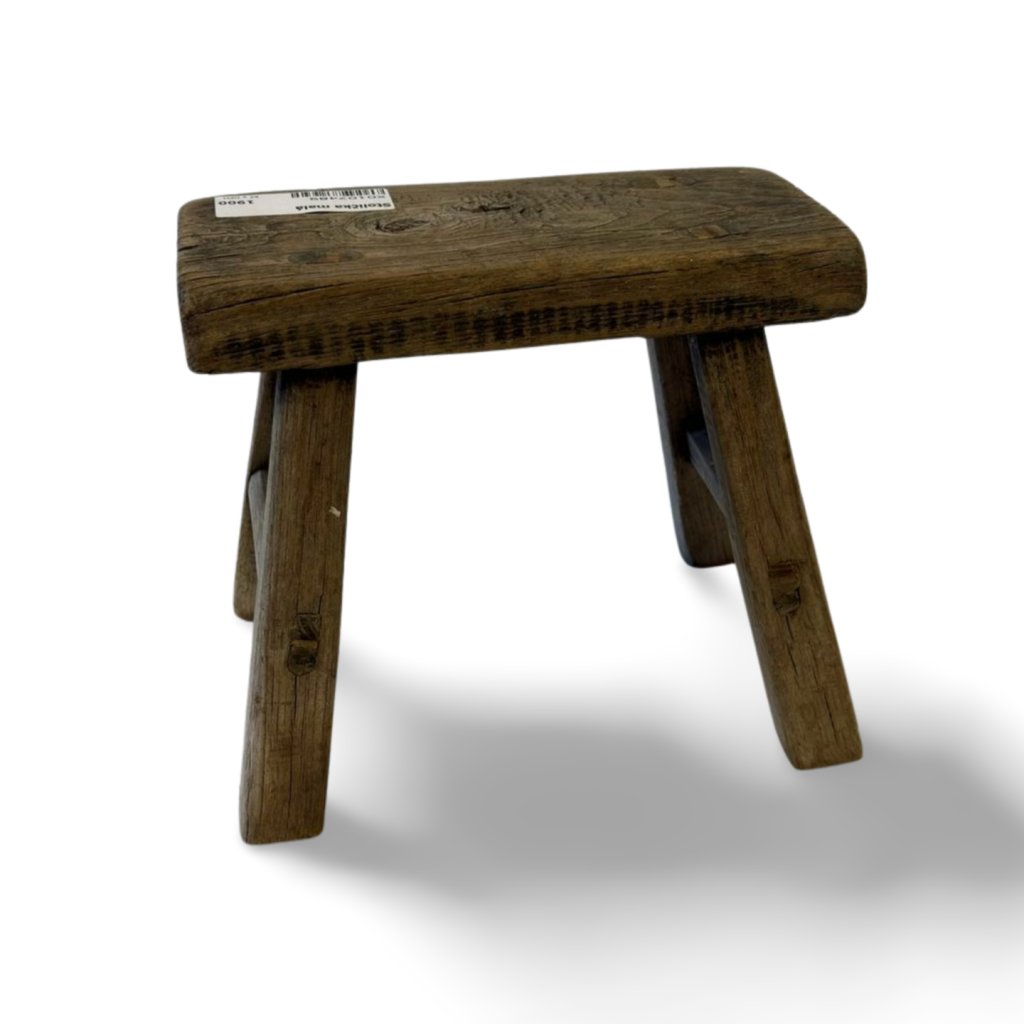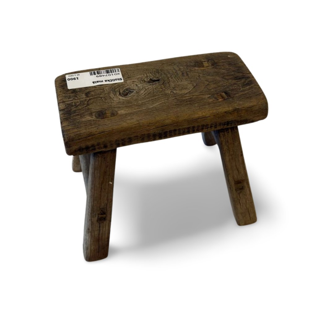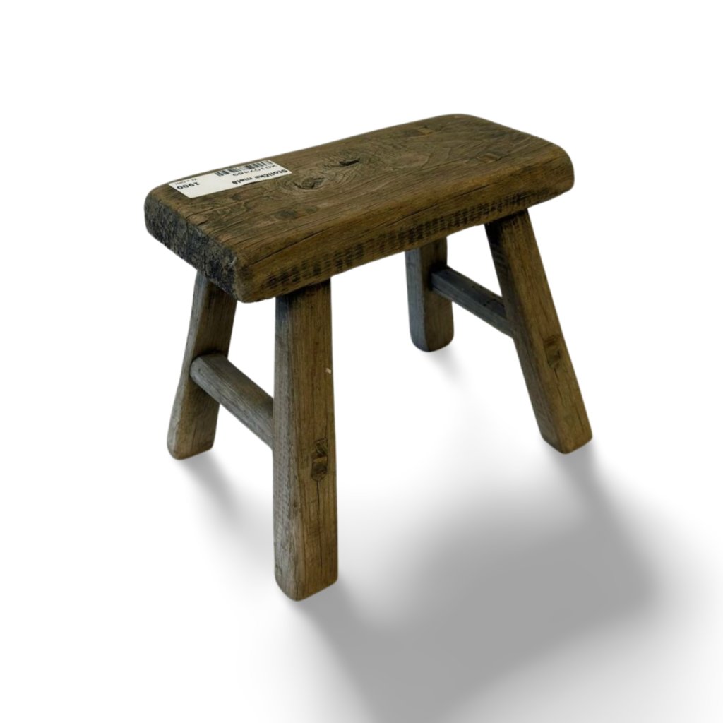 Originální malá čínská stolička z masivního dřeva vyniká jednoduchou konstrukcí a přirozenou patinou, která podtrhuje její autentický původ. Každý kus je jedinečný díky odlišné kresbě dřeva, jemným prasklinám a stopám času.