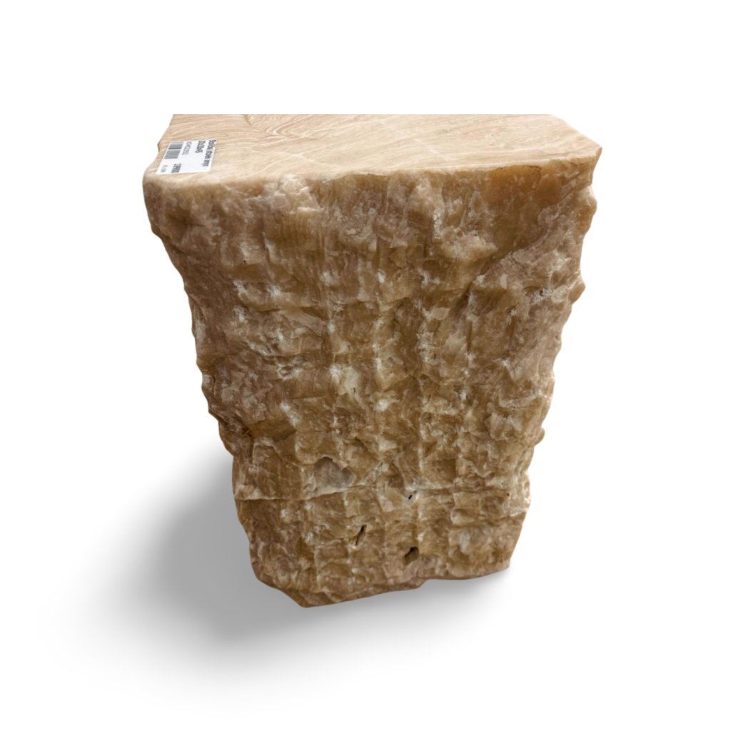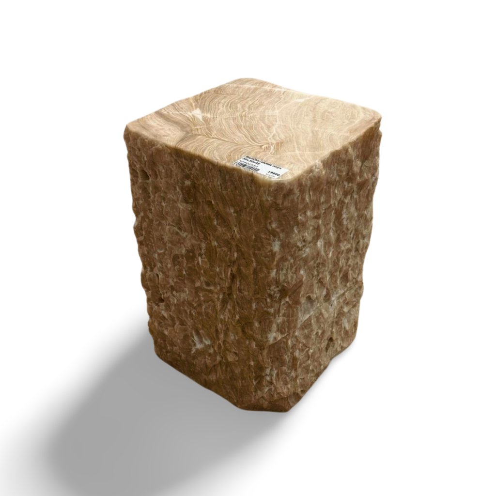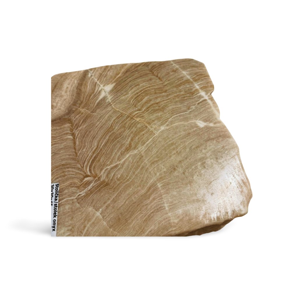 Tento originální stolek nebo stolička je vyrobený z masivního bloku přírodního onyxu. Každý kus je ručně opracovaný tak, aby vynikla přirozená kresba kamene, jeho vrstvy a barevné přechody v teplých zemitých tónech. Horní plocha je jemně leštěná, zatímco boční strany si zachovávají surovější, přírodní strukturu.