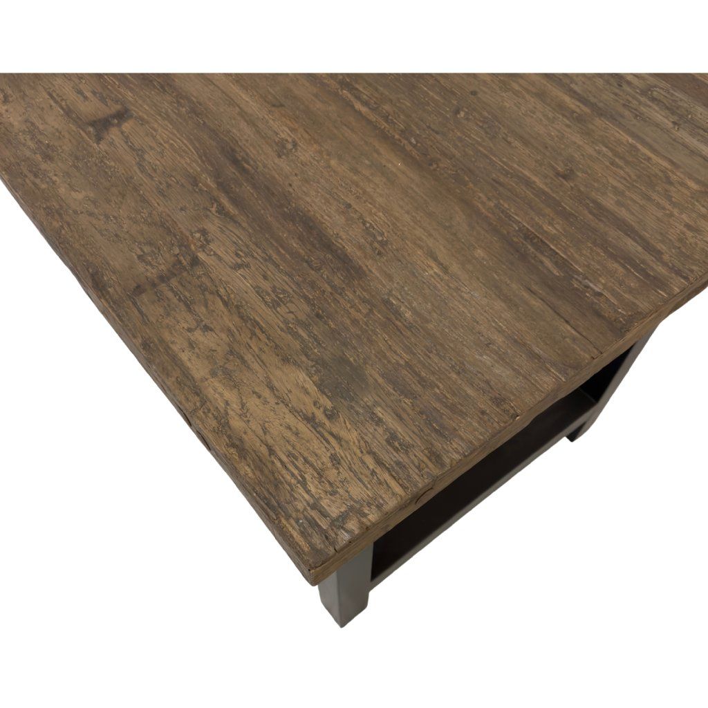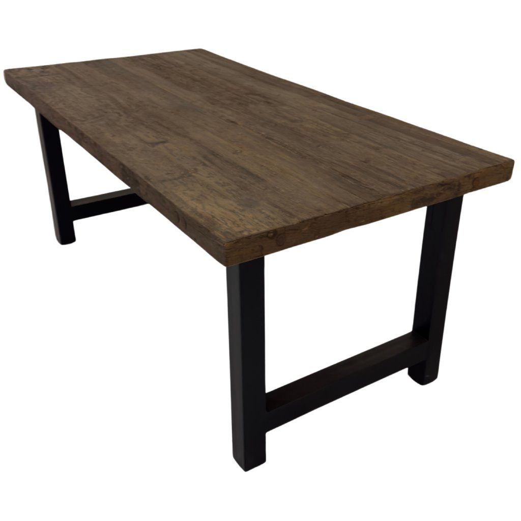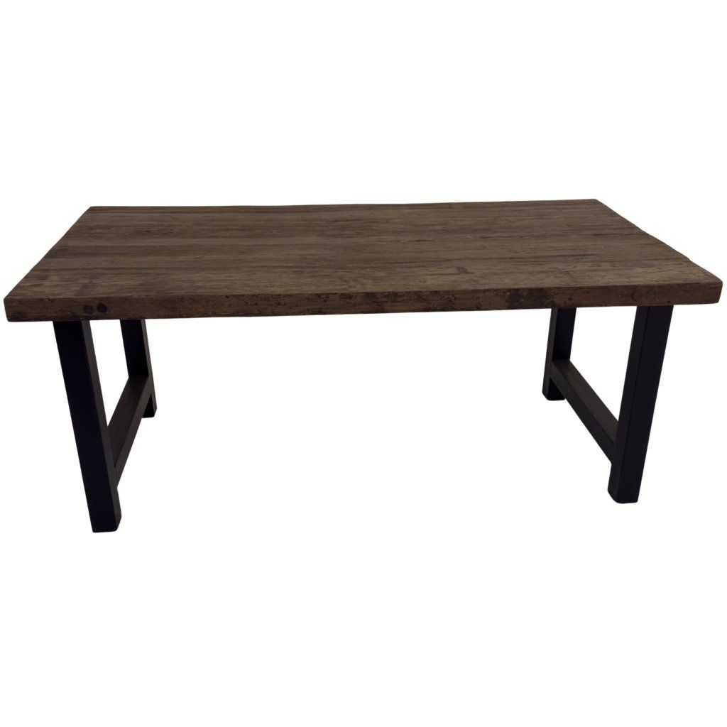 Masivní stůl z jilmového dřeva s kovovou podnoží. Nadčasový industriální design a pevná konstrukce pro každodenní použití.