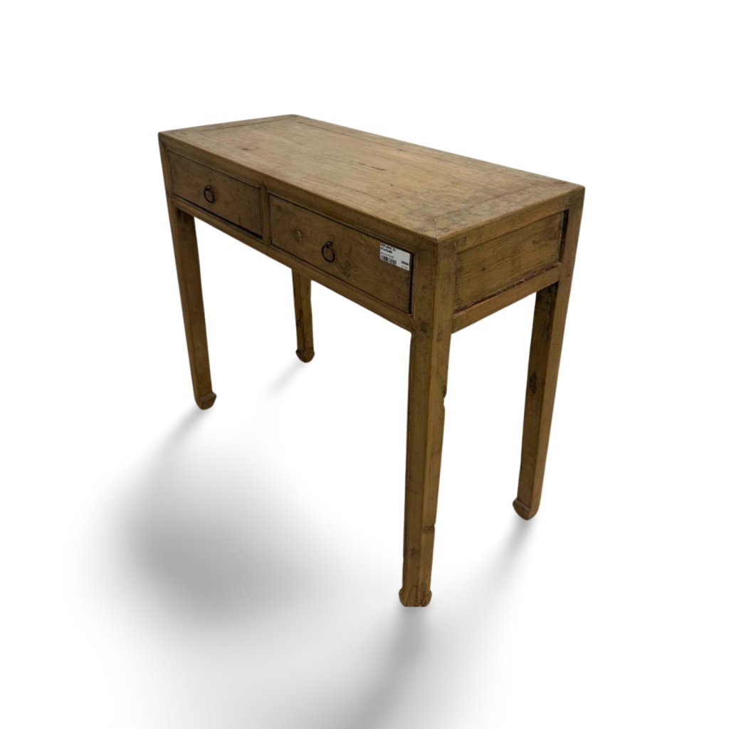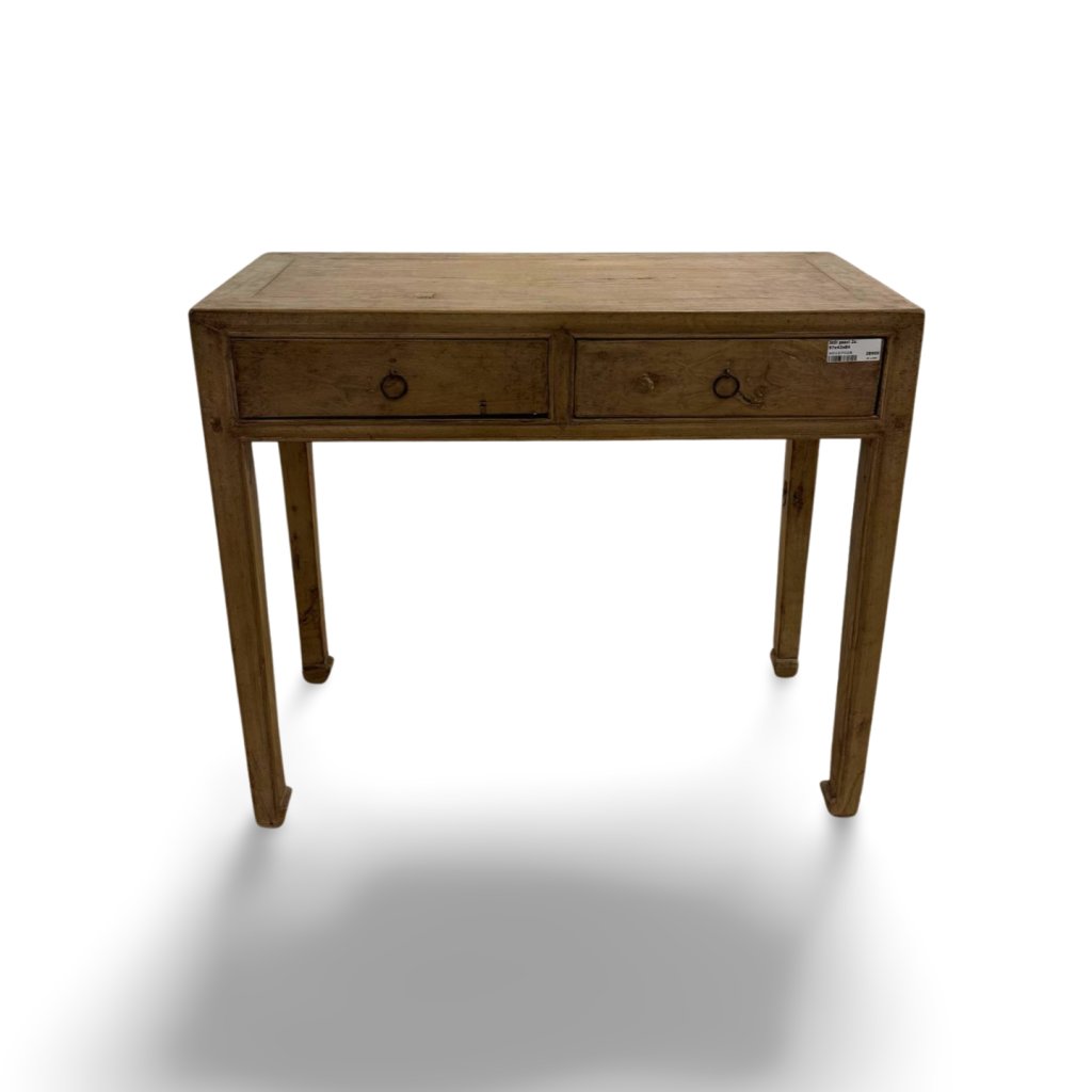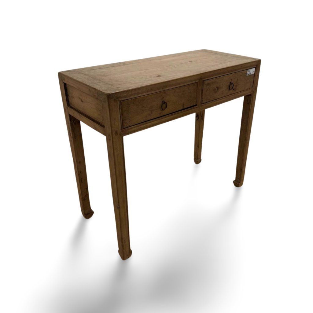 Tento psací stolek pochází z Číny a je vyrobený z masivního dřeva s přirozenou kresbou a decentní patinou. Jednoduché linie, štíhlé nohy a dvě praktické zásuvky mu dodávají lehký, elegantní vzhled, který se snadno kombinuje s moderním i tradičním interiérem.