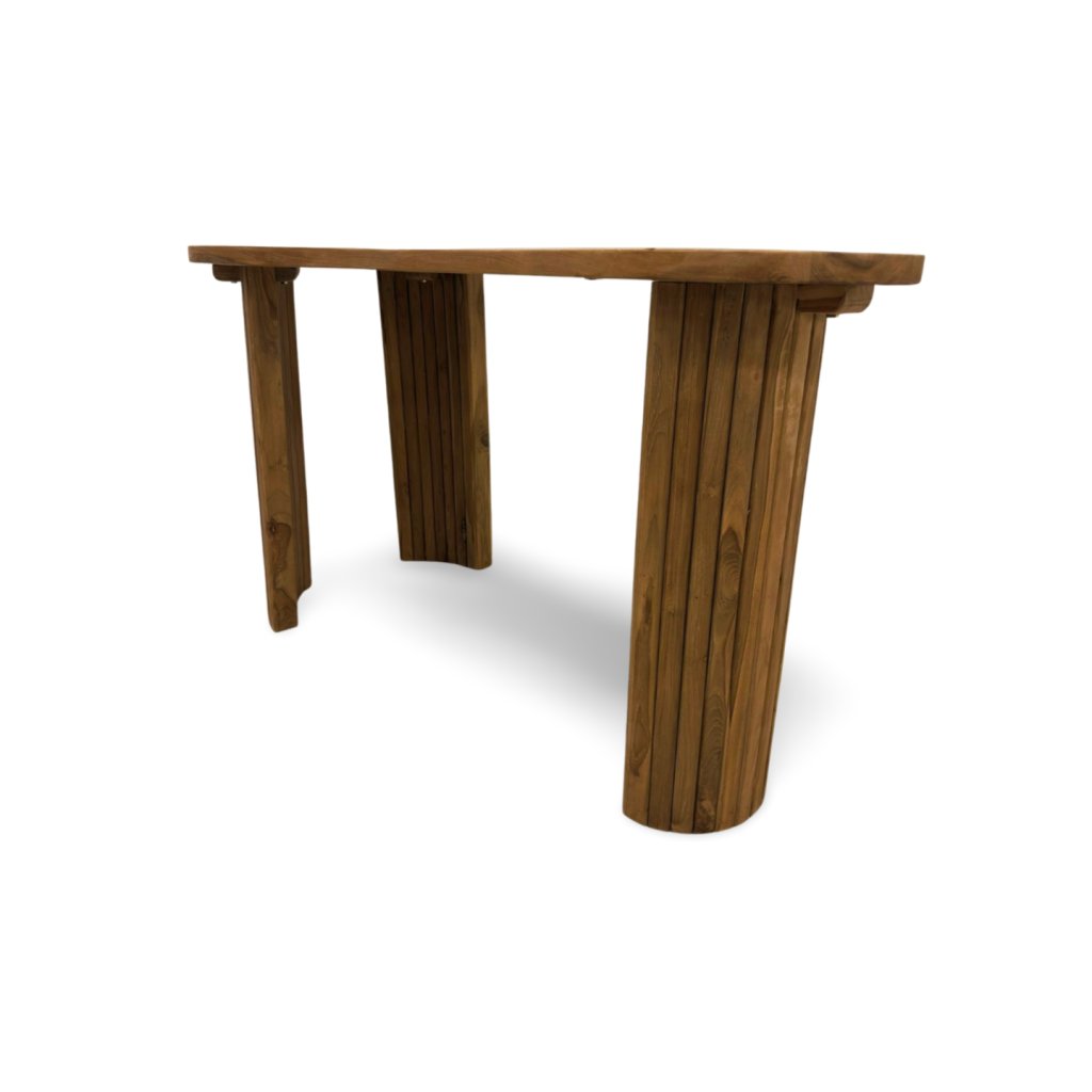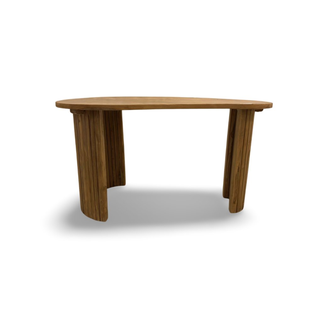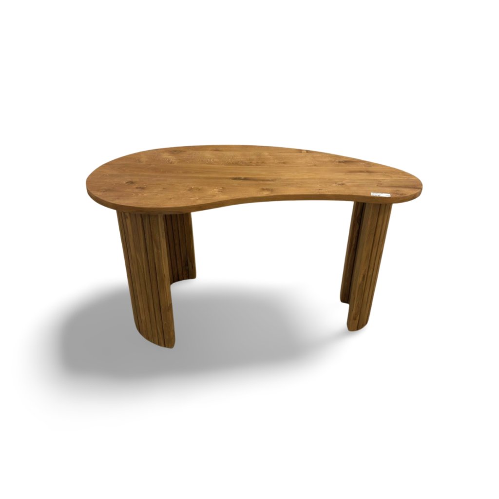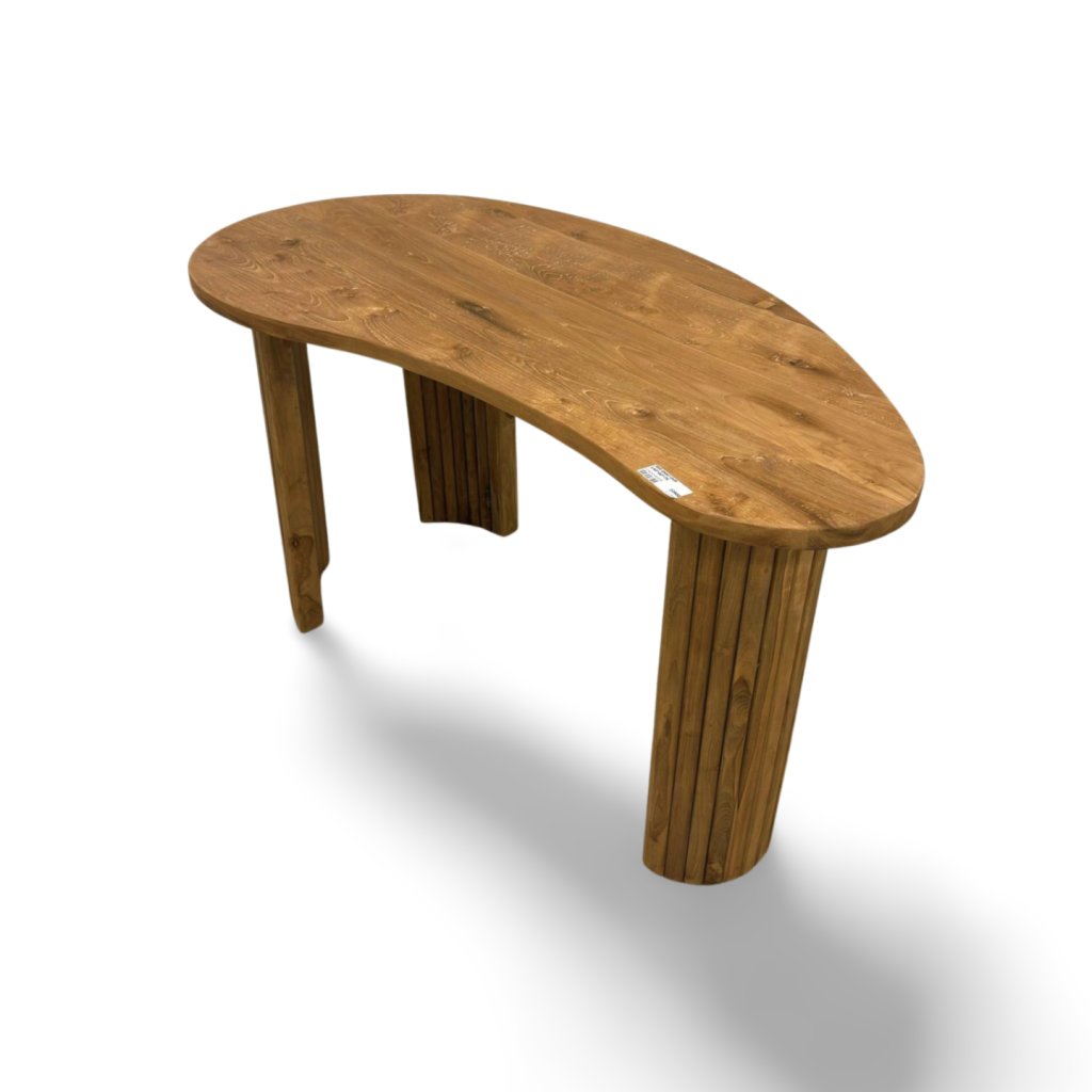 Psací stůl z masivního teaku zaujme svým netradičním, organicky tvarovaným provedením desky. Nejde o klasický rovný obdélník – deska má jemně zaoblený, plynulý tvar, který působí přirozeně, moderně a zároveň velmi elegantně.