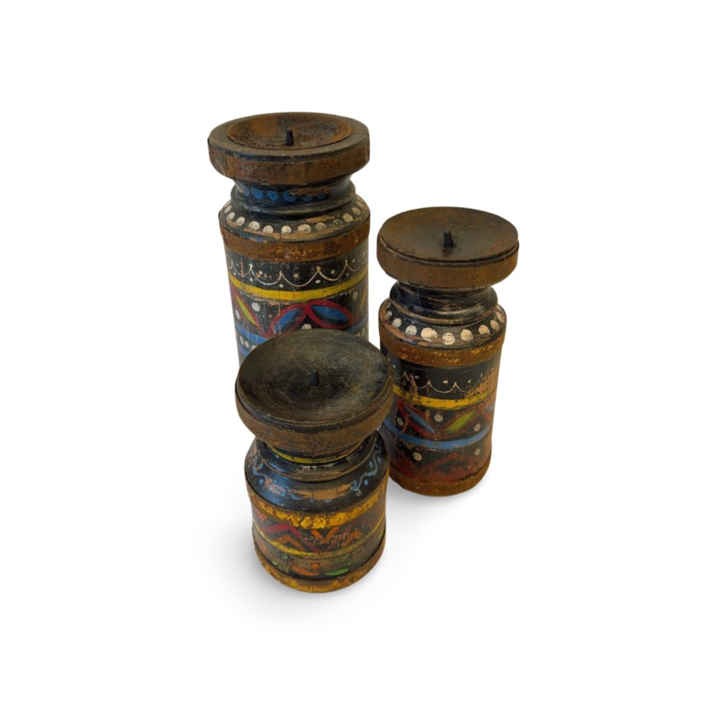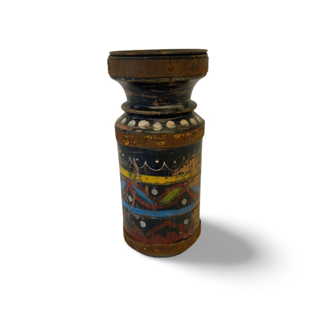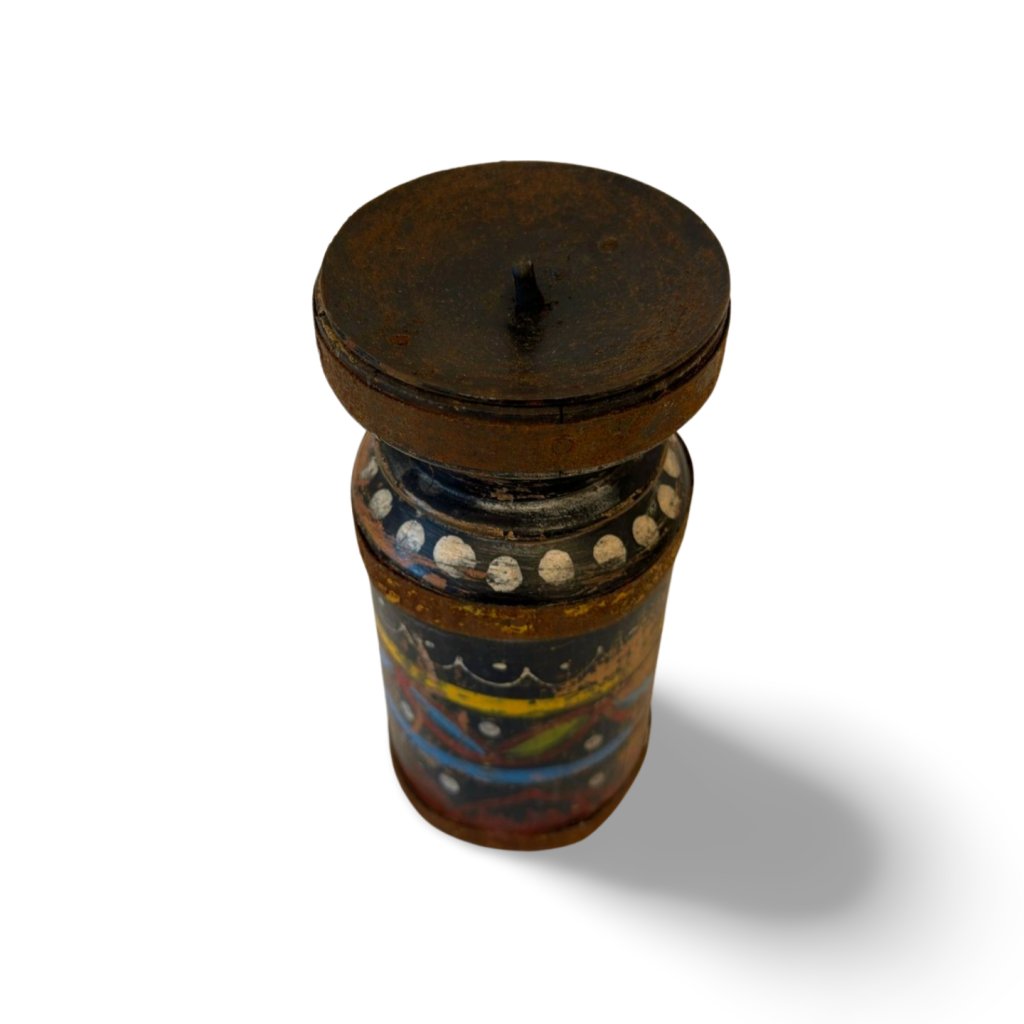 Ručně malovaný svícen z masivního dřeva ve velikosti M, který vyniká bohatými barevnými motivy, tradičními ornamenty a přirozeně zestárlým povrchem. Díky ručnímu zpracování a patině je každý kus naprostý originál s vlastním charakterem.