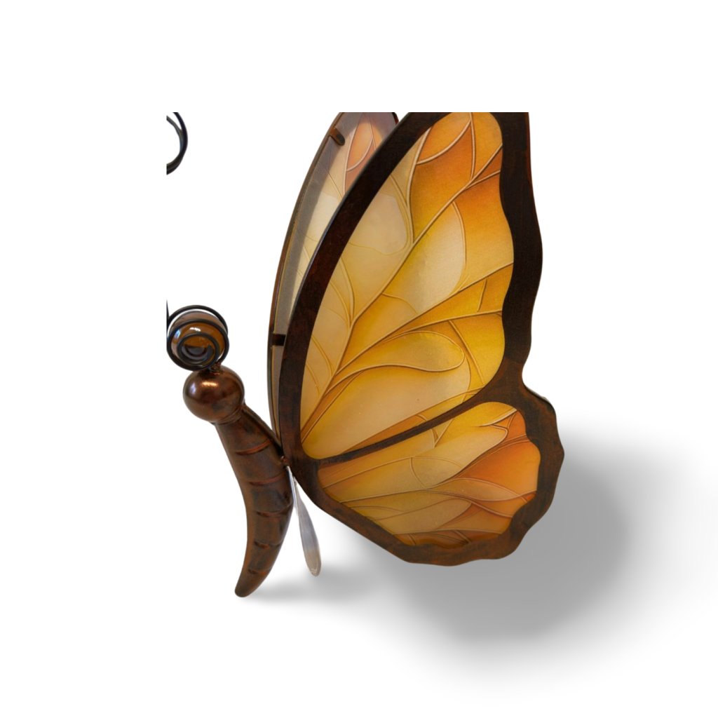 Křídla z barevného skla jsou vsazena do kovového rámu, který svícnu dodává stabilitu a elegantní kontrast. Díky svému dekorativnímu provedení působí svícen jako malý umělecký objekt – vynikne sám o sobě i jako součást aranže s dalšími svícny nebo dekoracemi.