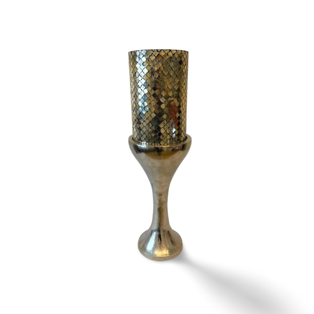 Tento stříbrný svícen zaujme kombinací kovového podstavce a výrazného skleněného cylindru s mozaikovým, šupinovým vzorem. Lesklý povrch odráží světlo svíčky a vytváří příjemnou atmosféru s jemnými odlesky, které se mění podle intenzity světla.