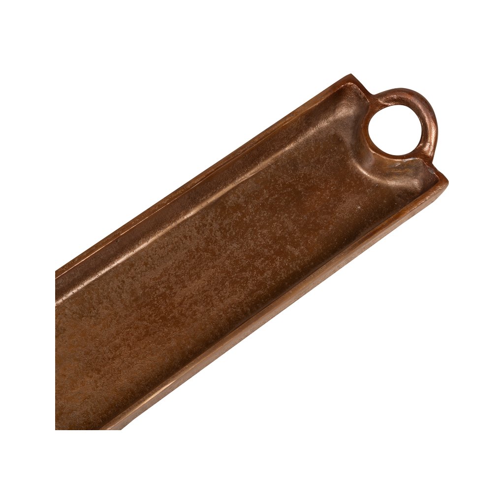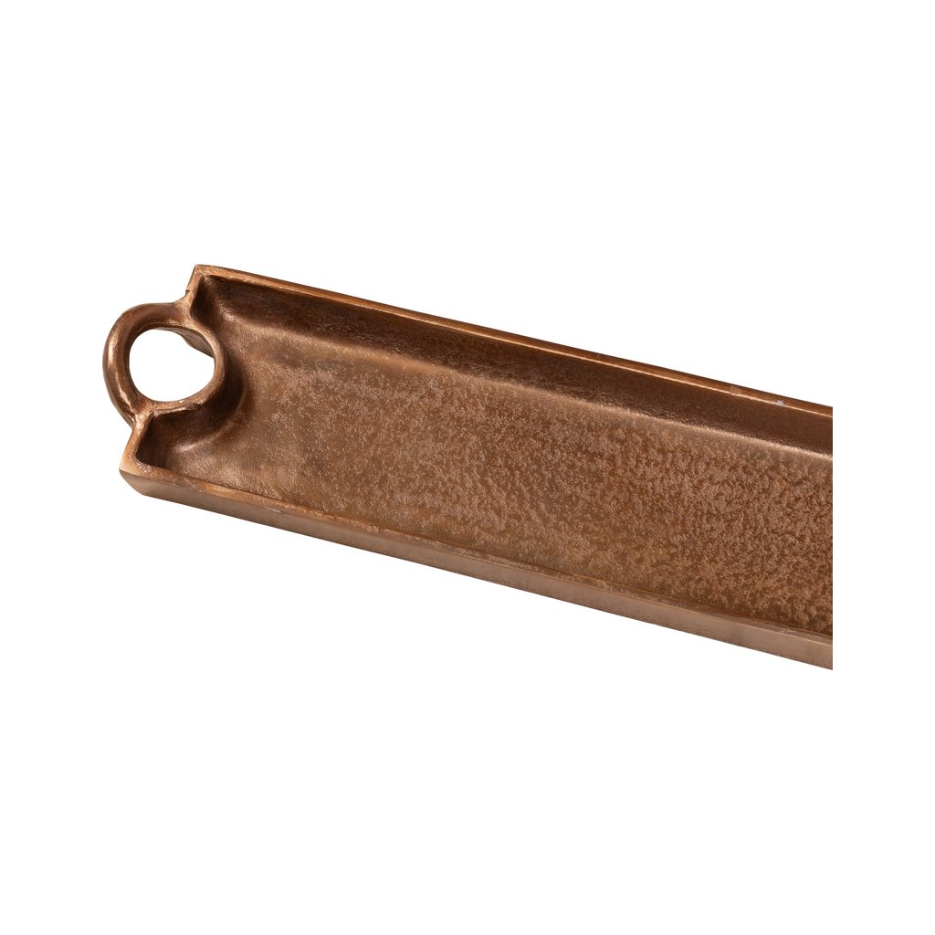 Díky zvýšeným okrajům a praktickým úchytům na obou stranách je vhodný nejen pro servírování nápojů, svíček nebo drobných pochutin, ale také jako dekorativní prvek na konferenčním stolku, komodě nebo barovém pultu. Skvěle se kombinuje s dalšími kovovými a přírodními doplňky.