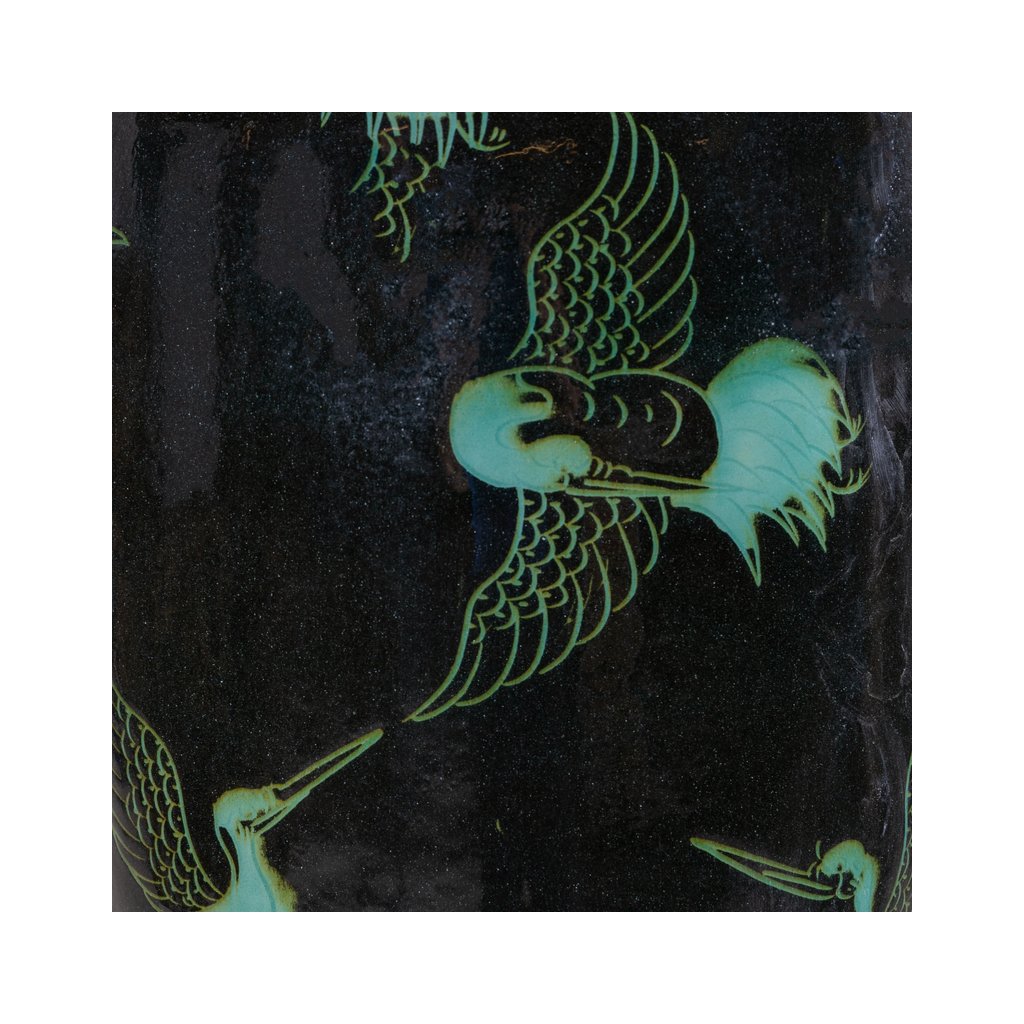 Tato keramická váza s motivem jeřábů vychází z tradiční asijské dekorativní tvorby, kde má každý prvek svůj význam. Jeřábi jsou symbolem dlouhověkosti, harmonie a štěstí, a proto se tento motiv často objevuje na uměleckých a dekoračních předmětech.
