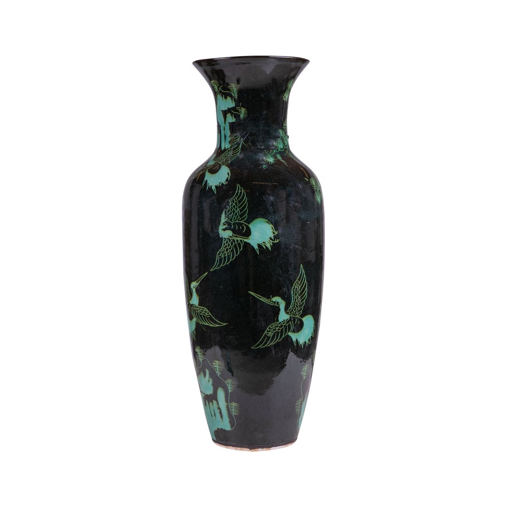 Tmavý, téměř černý základ kontrastuje s jemně zeleným dekorem ptáků v letu, což váze dodává výrazný, ale přesto elegantní charakter. Díky svému štíhlému tvaru se hodí jako solitérní dekorace – na komodu, konzolový stolek, do vstupní haly nebo obývacího prostoru.