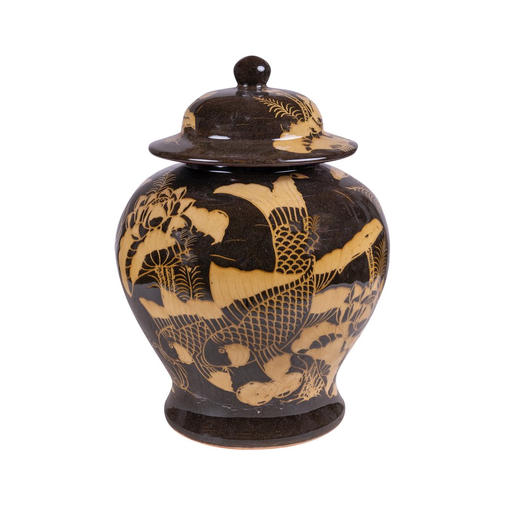 Tato váza s rybím vzorem zaujme na první pohled svým výrazným kontrastem tmavého podkladu a světlého, ručně vytvářeného dekoru. Motiv ryb, tradičně spojovaný s hojností, štěstím a harmonií, dodává váze hlubší symboliku i výraznou estetickou hodnotu.