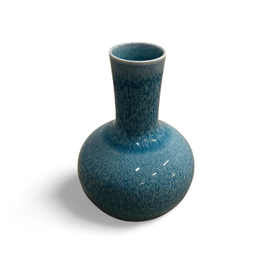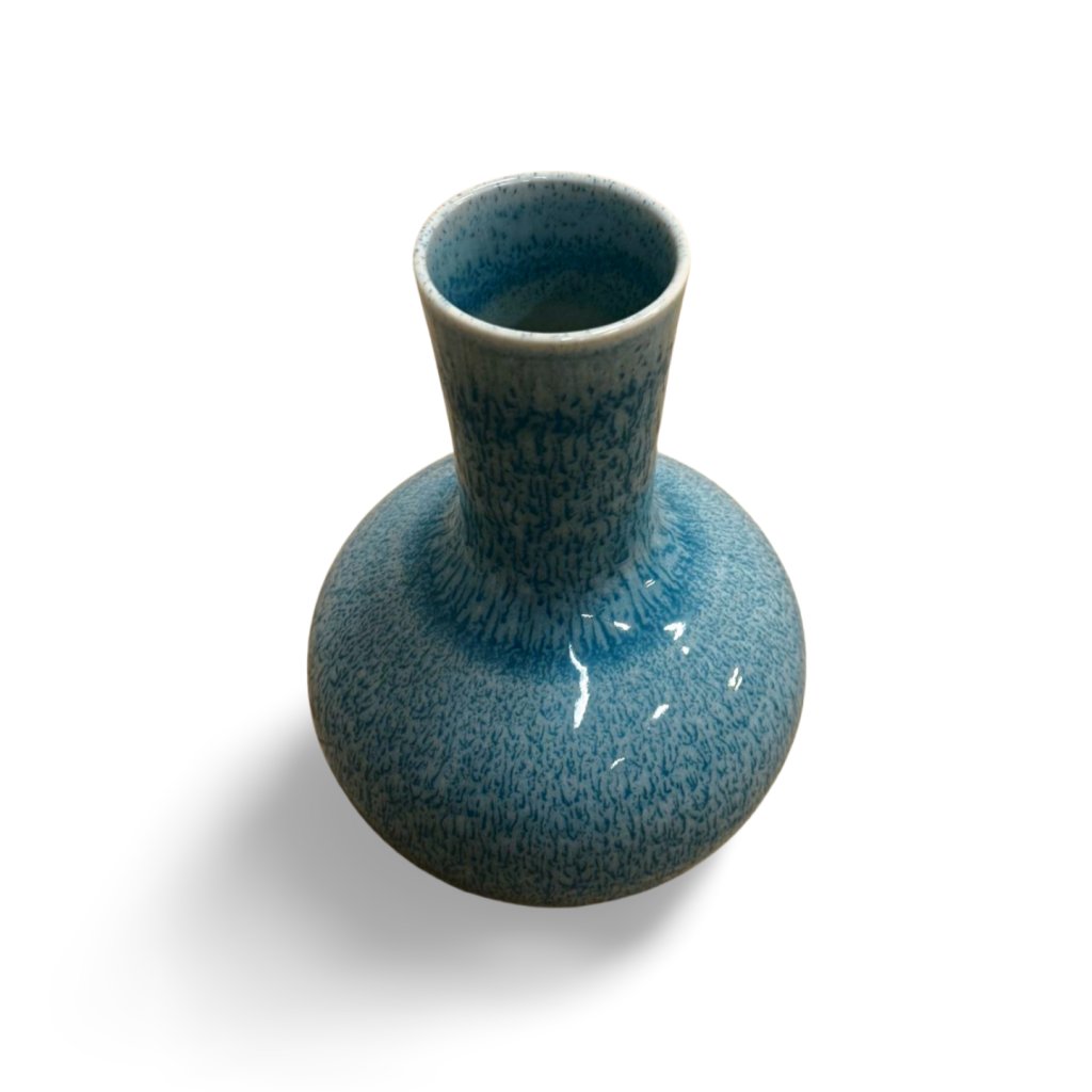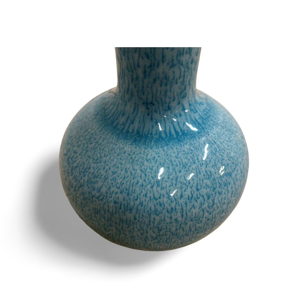 Tato modrá váza vyniká harmonickým kulatým tělem a štíhlým hrdlem, které jí dodává elegantní a nadčasový charakter. Povrch je opatřen jemně strukturovanou glazurou v odstínech modré, která vytváří zajímavý vizuální efekt a decentní hru světla.