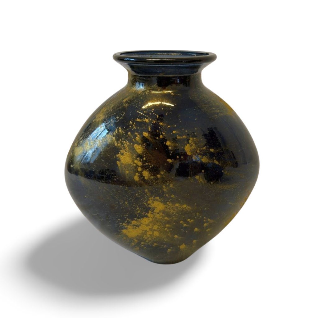 Tato skleněná váza zaujme svým plným, baňatým tvarem a kontrastem hluboké černé barvy se zlatými nepravidelnými efekty. Zlaté „stříkance“ na lesklém povrchu vytvářejí dojem ruční práce a dávají každému kusu originální charakter.