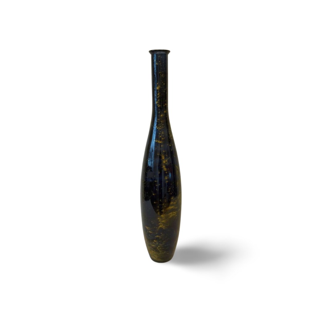 Tato štíhlá skleněná váza zaujme svou výraznou siluetou a hlubokou tmavou barevností. Černý základ je doplněn jemnými zlatými prvky, které se na světle prolínají do decentních modrých tónů. Lesklý povrch podtrhuje hloubku barev a vytváří luxusní vizuální efekt.