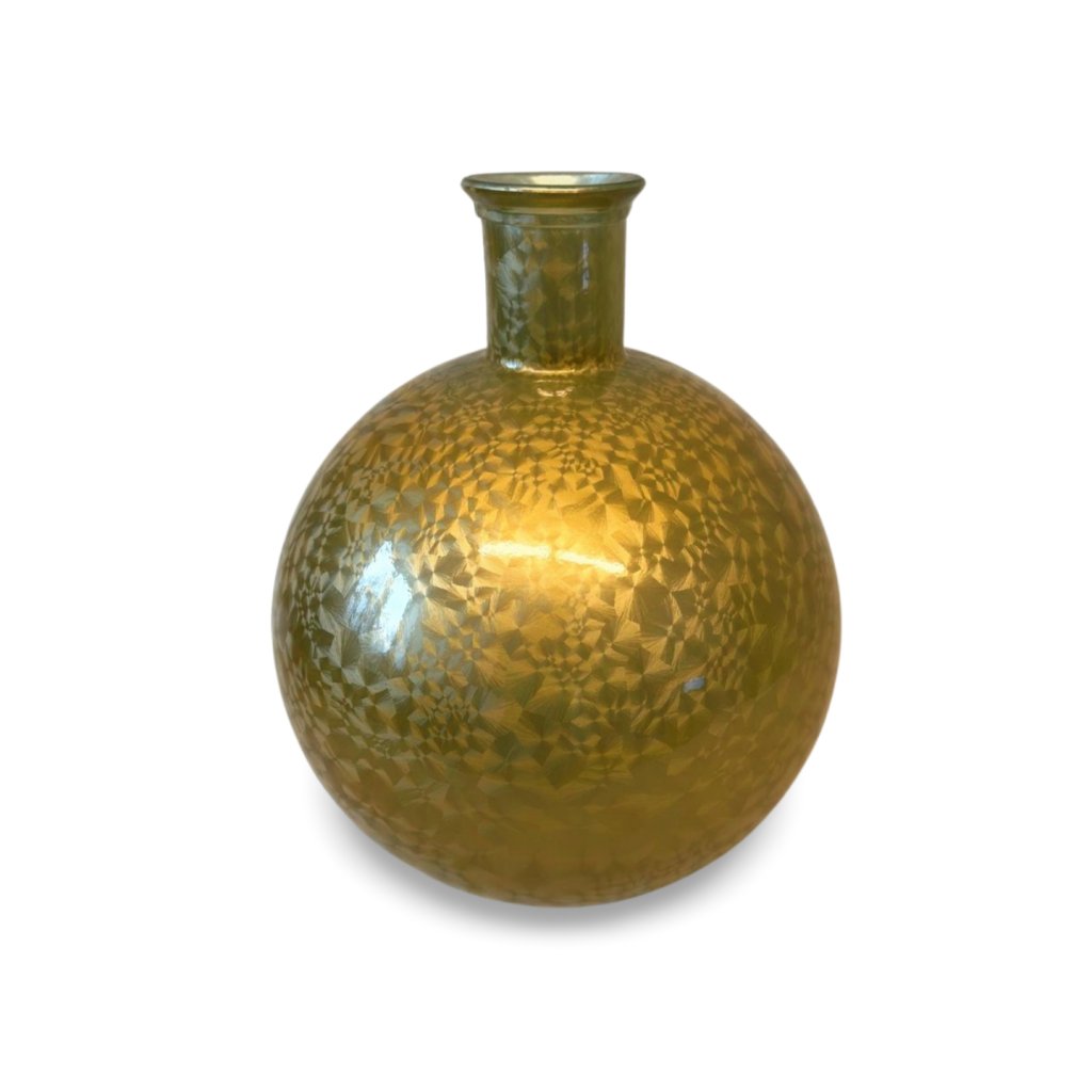 Tato skleněná váza zaujme na první pohled svým bohatým zlatým zabarvením a jemně mozaikovým povrchem, který vytváří originální strukturu po celém těle vázy. Díky nepravidelné kresbě se světlo krásně láme a povrch působí živě, plasticky a luxusně.
