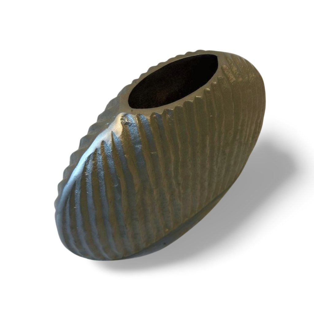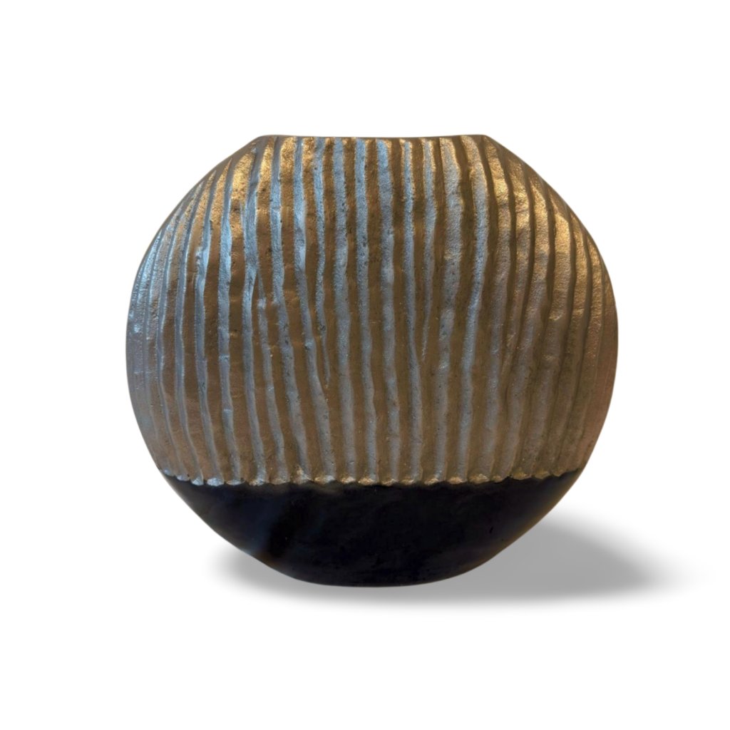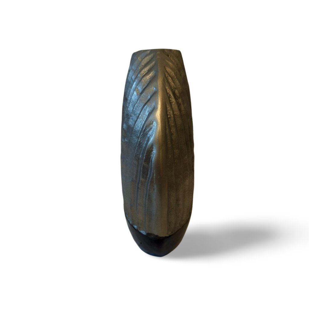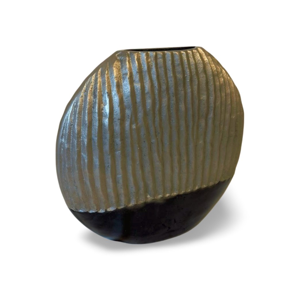 Tato kovová váza zaujme svým oválným tvarem a výraznou strukturou povrchu. Horní část je tvořena stříbrným reliéfem s jemně nepravidelnými vertikálními liniemi, které vytvářejí zajímavou hru světla a stínu. Spodní část v hlubokém černém odstínu dodává váze kontrast a vizuální ukotvení.