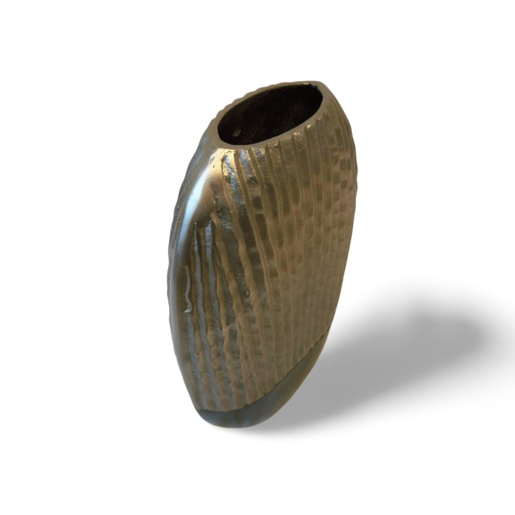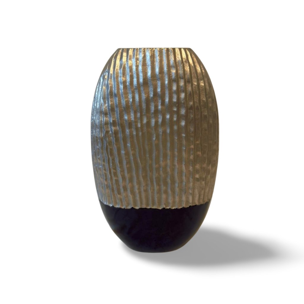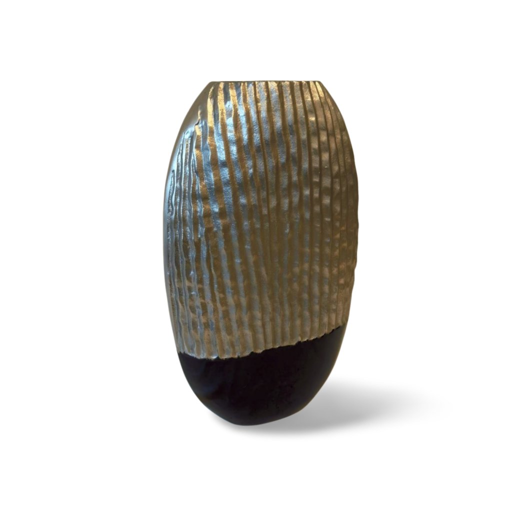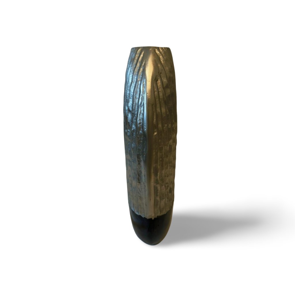 Tato vysoká kovová váza zaujme elegantní siluetou a strukturovaným povrchem. Horní část ve stříbrném odstínu je doplněna jemně nepravidelným vertikálním reliéfem, který odráží světlo a dodává váze živý, plastický výraz. Spodní část v matné černé barvě vytváří výrazný kontrast a opticky vázu ukotvuje.