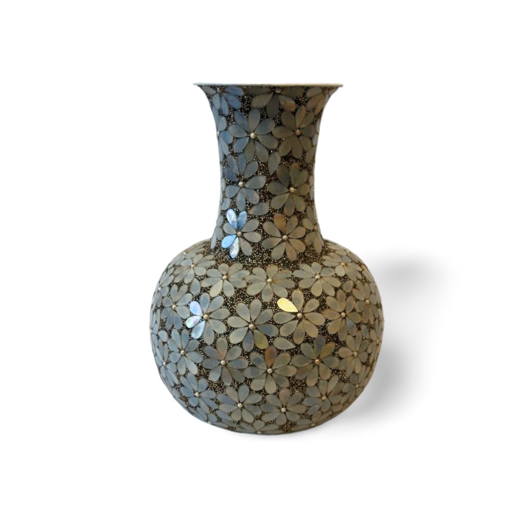 Tato stříbrná váza zaujme detailně zpracovaným květinovým motivem, který pokrývá celý její povrch. Jednotlivé květy vytvářejí plastickou strukturu s jemnou hrou světla, díky níž váza působí živě a elegantně z každého úhlu. Stříbrný odstín má lehce patinovaný efekt, který podtrhuje dekorativní charakter a dodává váze hloubku.