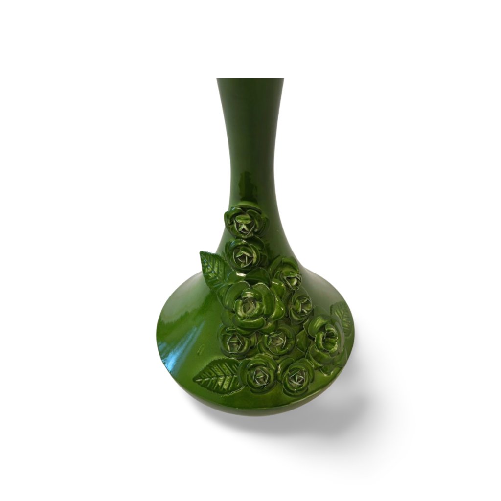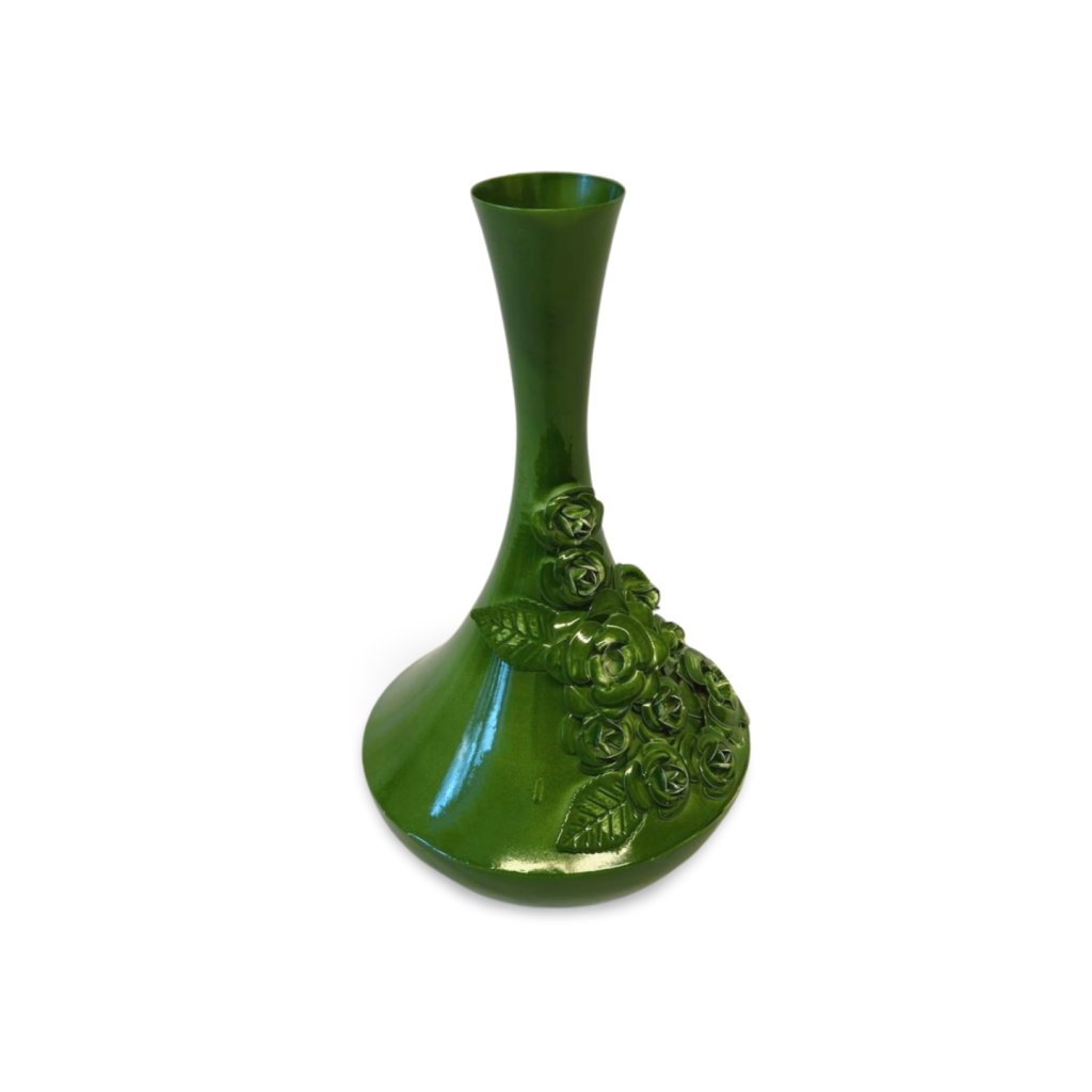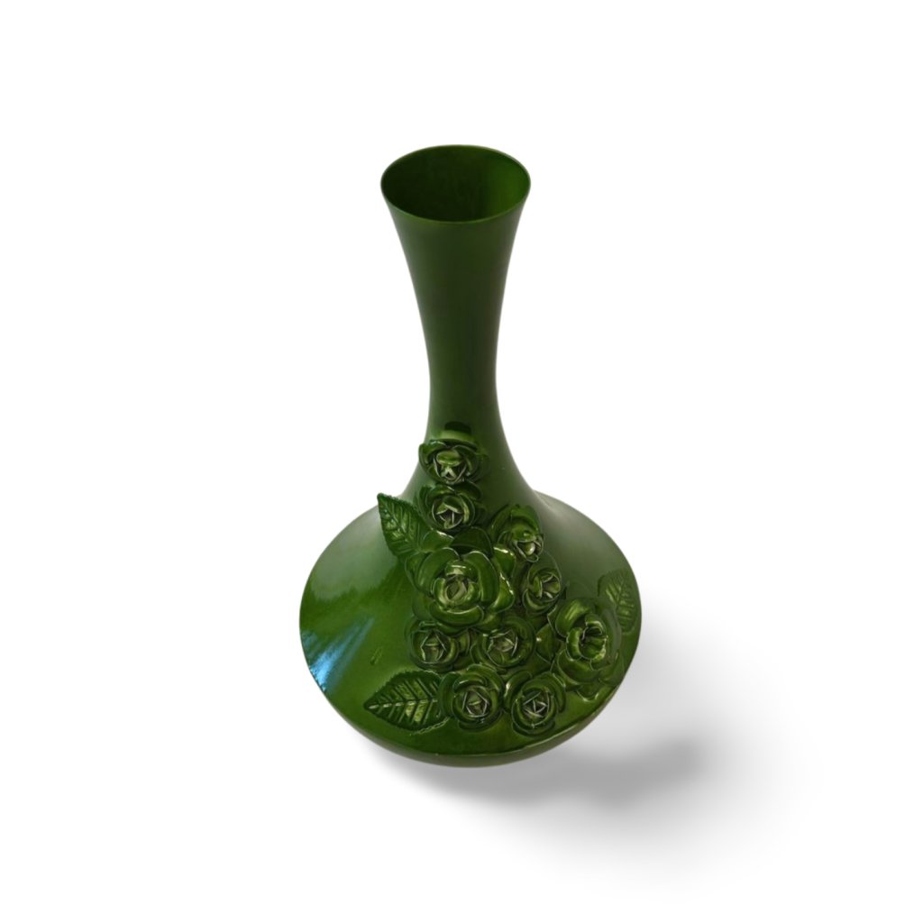 Tato kovová váza zaujme štíhlým tvarem a bohatě zdobeným reliéfem květin v podobě růží. Sytě zelená glazura s jemným leskem zvýrazňuje plastické detaily a dodává váze luxusní, lehce romantický charakter.
