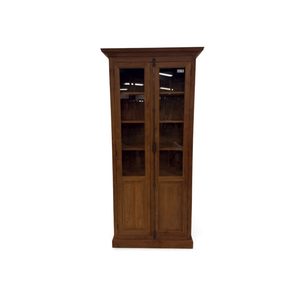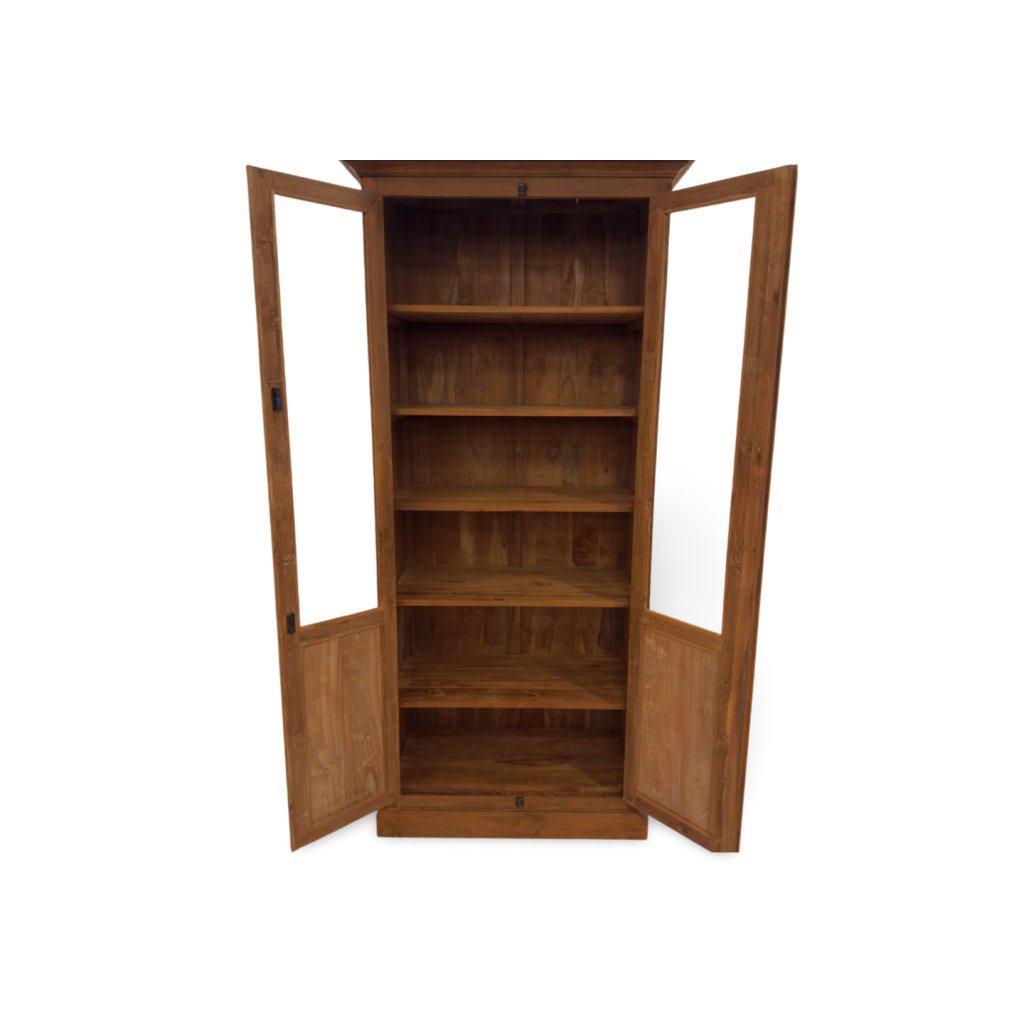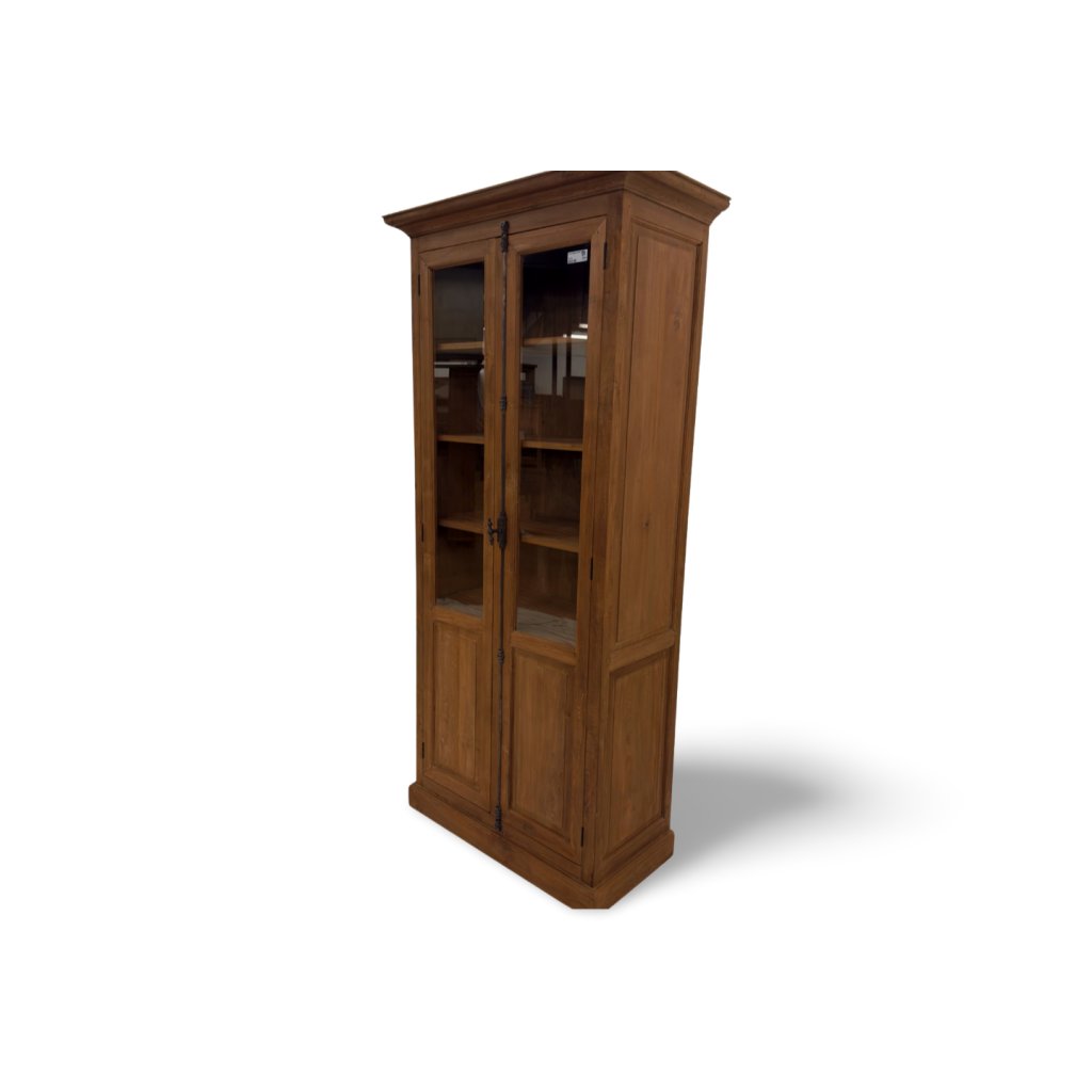 Tato vitrína z teakového dřeva je nejen krásným kusem nábytku, ale i technicky zajímavým řešením pro váš interiér. Inovativní mechanismus otevírání využívá kovovou ručku, která se otáčí a tím elegantně zasouvá kovovou tyč do zámku, čímž umožňuje plynulé otevírání a zavírání dveří. Tento unikátní systém je nejen funkční, ale také vizuálně přitažlivý a přidává vitríně jedinečný charakter. Dřevo teaku, známé svou odolností a krásnou texturou, se harmonicky spojuje s tímto propracovaným mechanismem, čímž vzniká stylový a praktický kousek nábytku.
