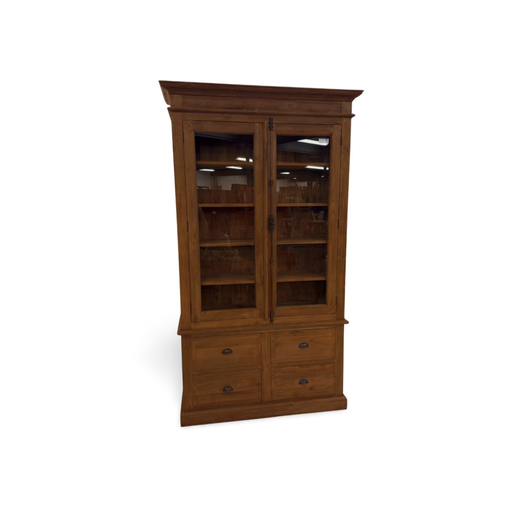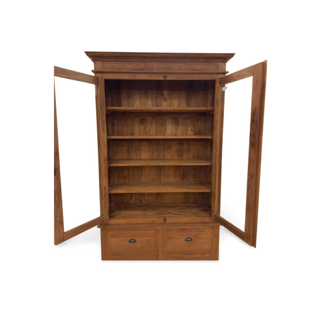 Tato masivní vitrína z teakového dřeva kombinuje elegantní design s praktickými funkcemi. Inovativní systém otevírání využívá otočnou kovovou ručku, která otáčením zasouvá kovovou tyč do zámku a umožňuje hladké otevření a zavření dveří. Vespod jsou čtyři prostorné zásuvky, které poskytují dodatečný úložný prostor a přidávají nábytku na funkcionalitě. Teakové dřevo, známé svou pevností a krásnou texturou, v kombinaci s tímto sofistikovaným mechanismem činí vitrínu nejen praktickým, ale i vizuálně impozantním kouskem, který se hodí do každého interiéru.