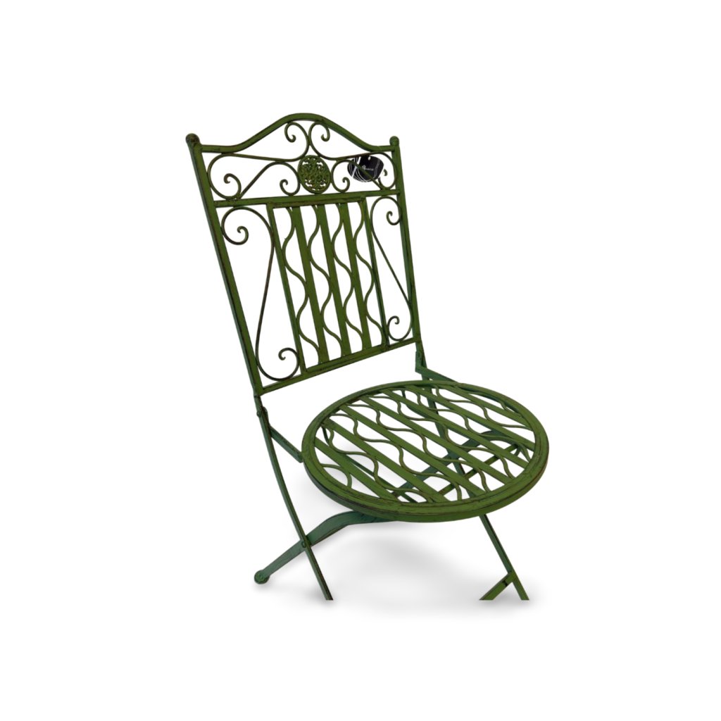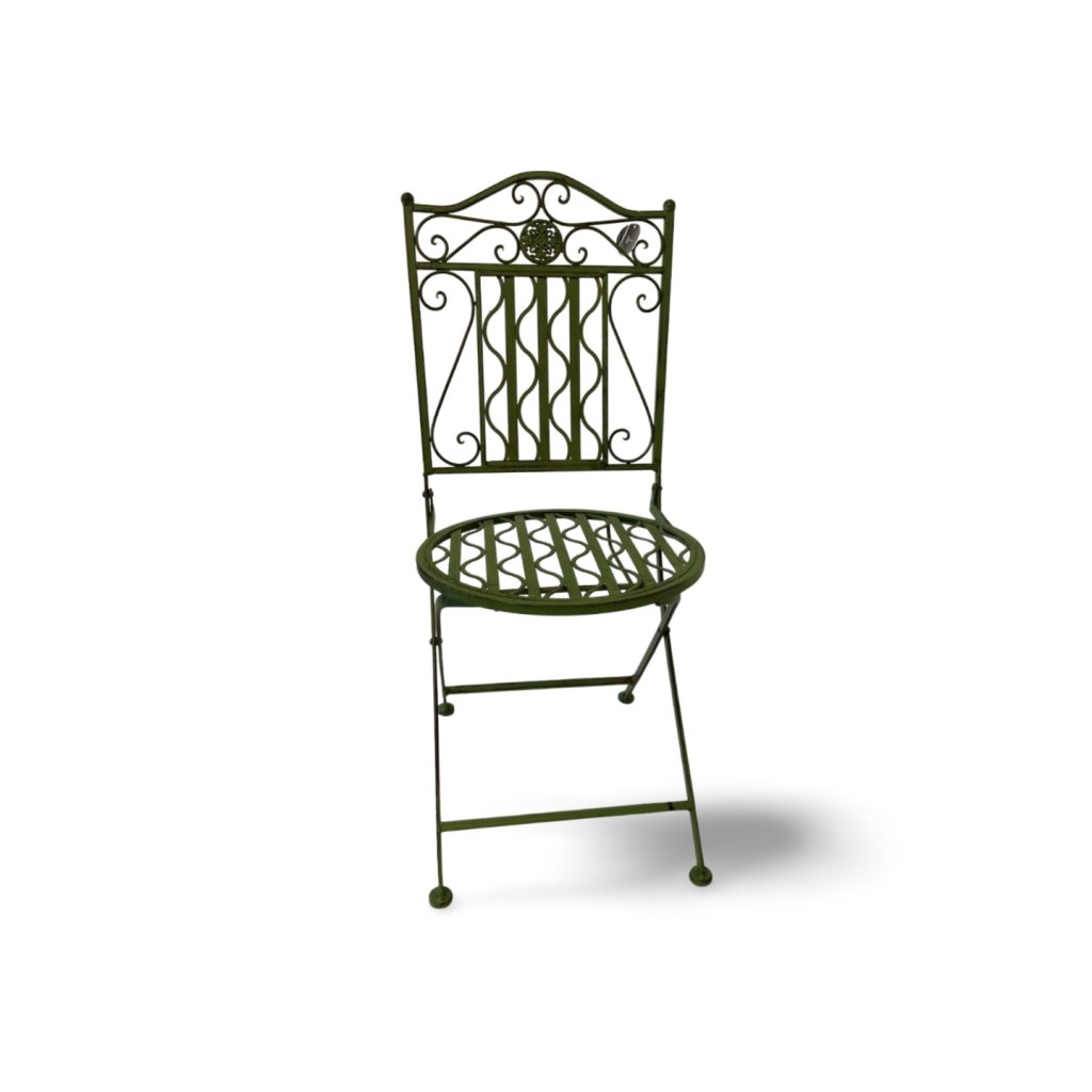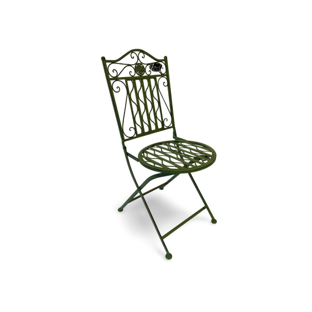 Skládací kovová židle v zeleném provedení zaujme svým romantickým zdobením a lehkým vintage nádechem. Opěradlo i sedák jsou dekorativně tvarované s jemnými ornamenty, které dodávají židli elegantní a vzdušný vzhled.