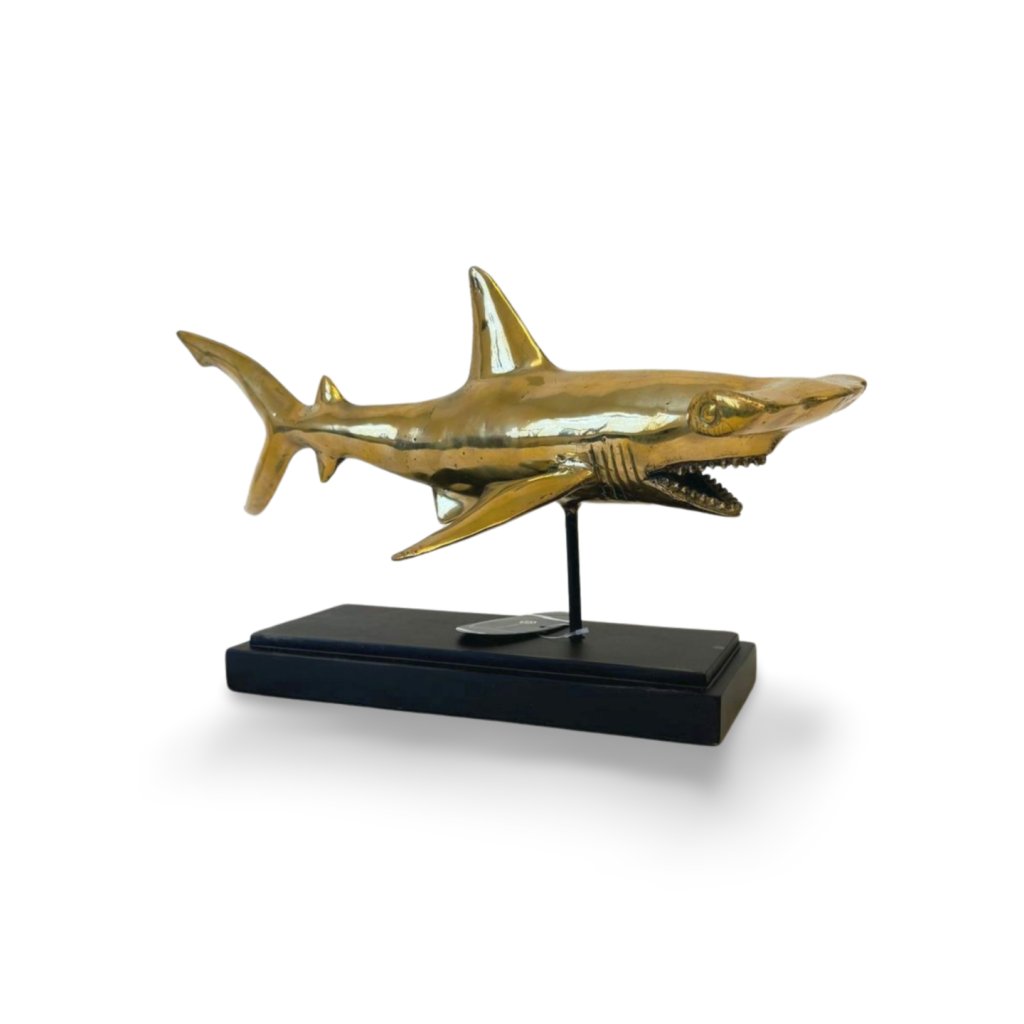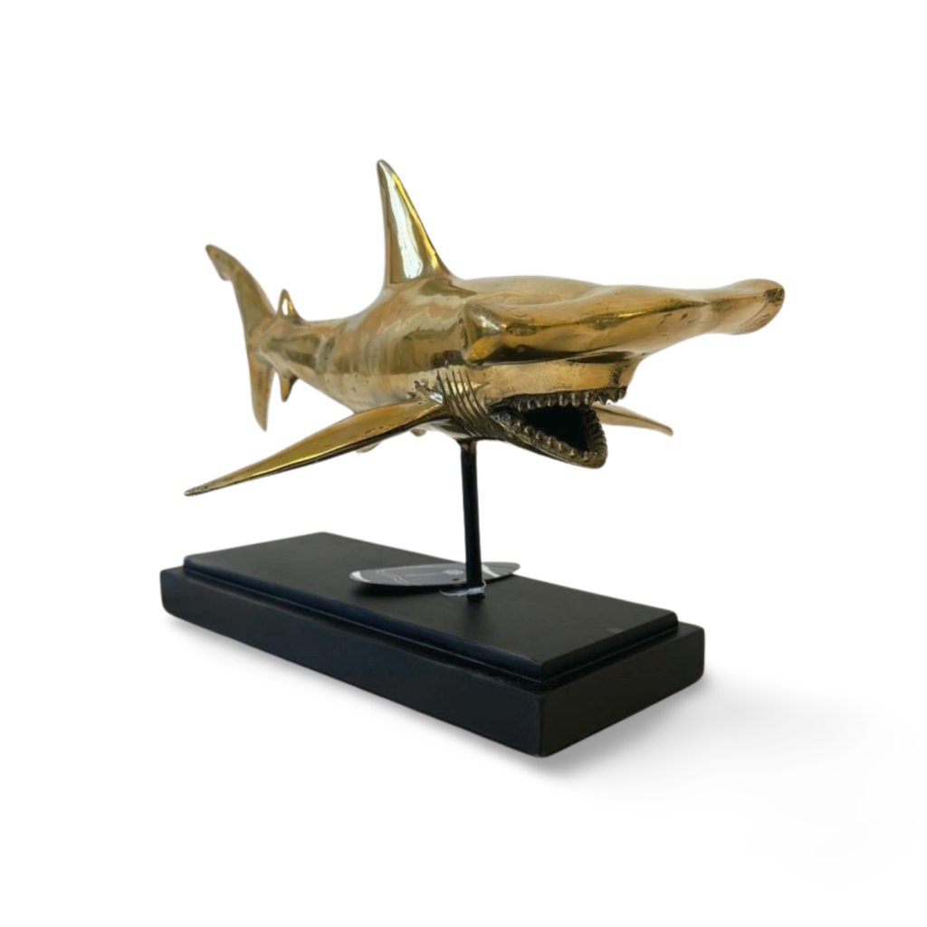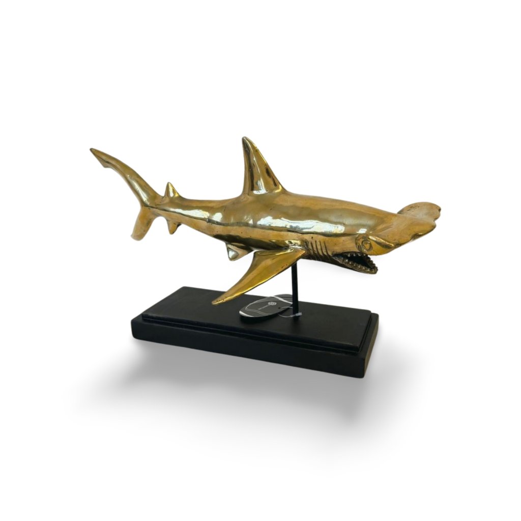 Výrazná dekorativní soška žraloka kladivouna z kovu v teplém brass odstínu zaujme na první pohled svým dynamickým tvarem a precizním zpracováním. Lesklý povrch zvýrazňuje linie těla, detaily ploutví i charakteristický tvar hlavy, díky čemuž působí dekorace velmi živě a luxusně.