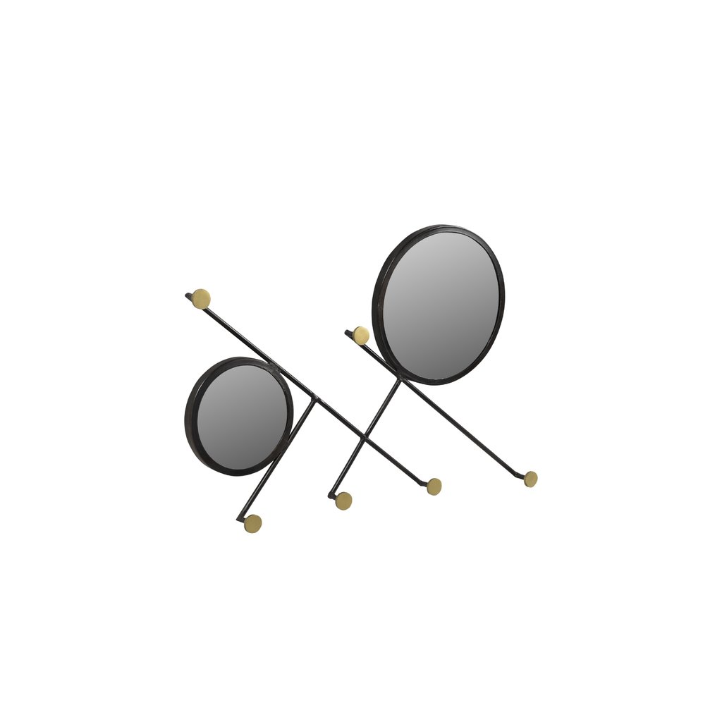 Tento nástěnný věšák v sobě spojuje funkčnost a neotřelý design. Kovová konstrukce je zakončena háčky, ideálními na kabáty, tašky nebo klíče. Mezi nimi jsou zasazena dvě kulatá zrcátka, která nejen rozjasní prostor, ale také poslouží k poslednímu pohledu před odchodem z domu. Díky svému originálnímu vzhledu je věšák nejen praktickým pomocníkem, ale i zajímavým dekoračním prvkem na stěnu. Skvěle zapadne do industriálně nebo eklekticky laděného interiéru.