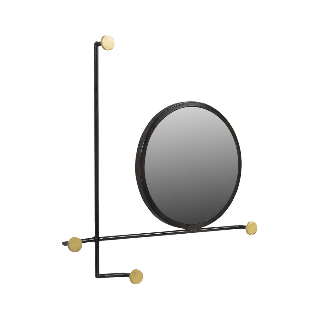 Tento nástěnný věšák kombinuje jednoduchý design s důmyslnou funkčností. Kovová kostra nese háčky pro odložení drobností a zároveň elegantně rámuje jedno kulaté zrcátko, které prostor opticky odlehčí. Minimalistické provedení z něj činí univerzální doplněk vhodný do moderních i industriálních interiérů. Skvěle poslouží jako poslední kontrolní bod před odchodem i jako decentní dekorace na stěně.